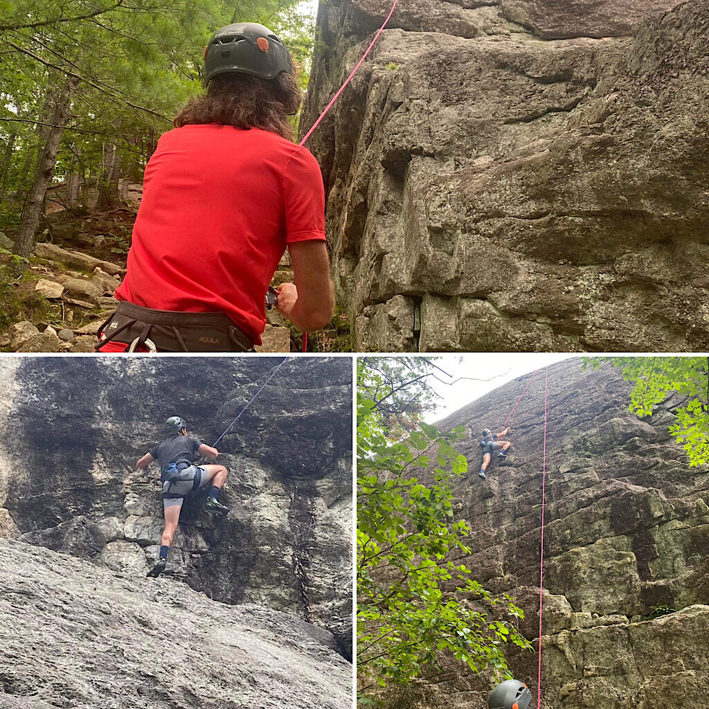 You’ve probably heard of crack climbing, using fissures in the rock to climb and protect a route. We’re going to take that meaning, however, and twist it to suit our narrative. In this case the crack was in the weather as well as in a thin space on the clock. Our guests, a returning couple who normally climb in a gym, were driving up from New York on the morning of the event. Today was the day! It was nice. Not too hot, not too cool. And not raining… yet. On lead for this day of rock climbing was Redline Guide Will Murphy. To avoid rain, or at least delay its presence, Will decided on taking the couple to Jockey Cap, a prominent crag in Fryeburg, Maine. Here are some photos.