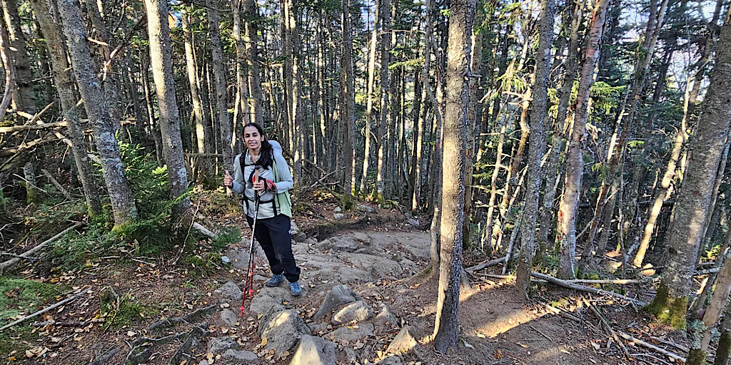 A many time returning guest from New Jersey was making the drive up to hike with us to grab the Southern Presidentials — at least from Eisenhower to Jackson, that is. The reason: plugging holes in her quest to complete all of the 4000-footers. In typical hiker fashion, she decided to make the trip even more worthwhile adding an extra day so as to tackle two more peaks, namely the Osceolas. Her guide on both days was Redline Guide Debra McCown who reported: “We had great weather and views, she loved the trails, and she accomplished a challenging feat: climbing the infamous Osceola chimney!” Now for some photos…