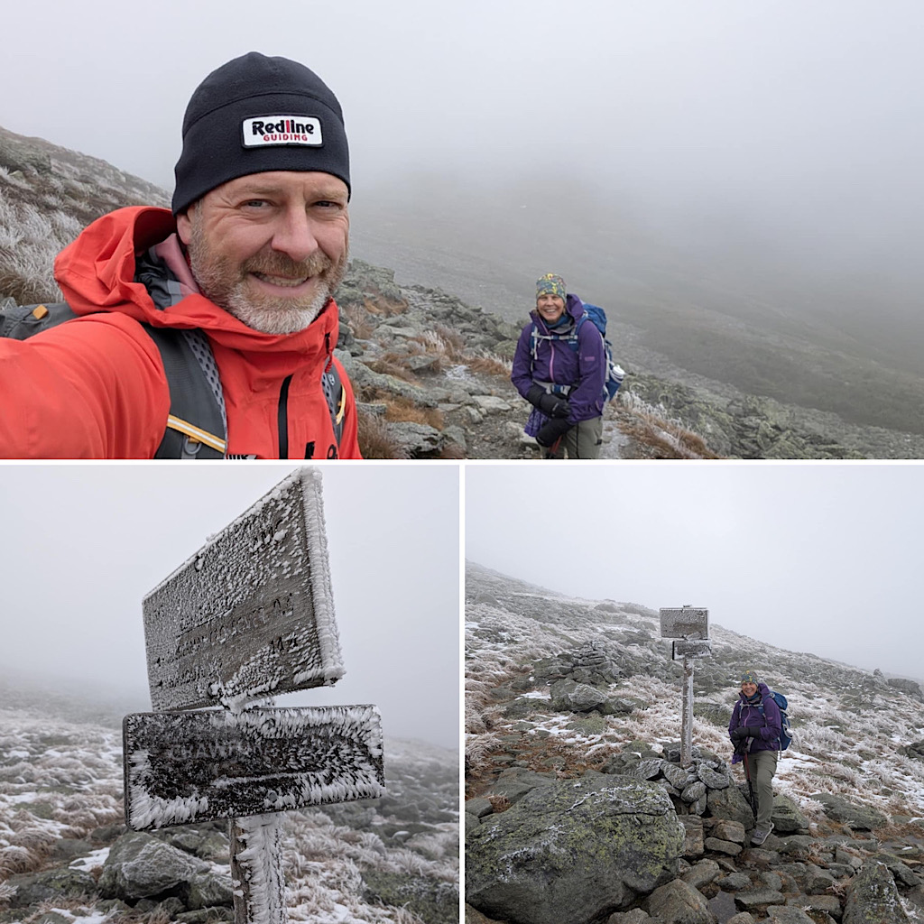 Redline Guide Eric Hansen had set a turnaround time for safety reasons, but upon reaching the boarded up Lakes of the Clouds hut there was still time to make it and he suggested they continue onward, at least for a bit. Our guest agreed and they proceeded toward the summit. It was apparent, however, that there would be no views from the top and the “cone” was socked in. That fact, coupled with an approaching deadline, coupled with the slower pace, and coupled with a weariness setting in, sealed the deal and the team turned around heading back the way they came. You might think that this was a huge disappointment to our guest, but you would be wrong. She loved the experience, thought Eric did a terrific job, and she has no regrets whatsoever. After the hike she did comment, though. “It’s easier in winter.”