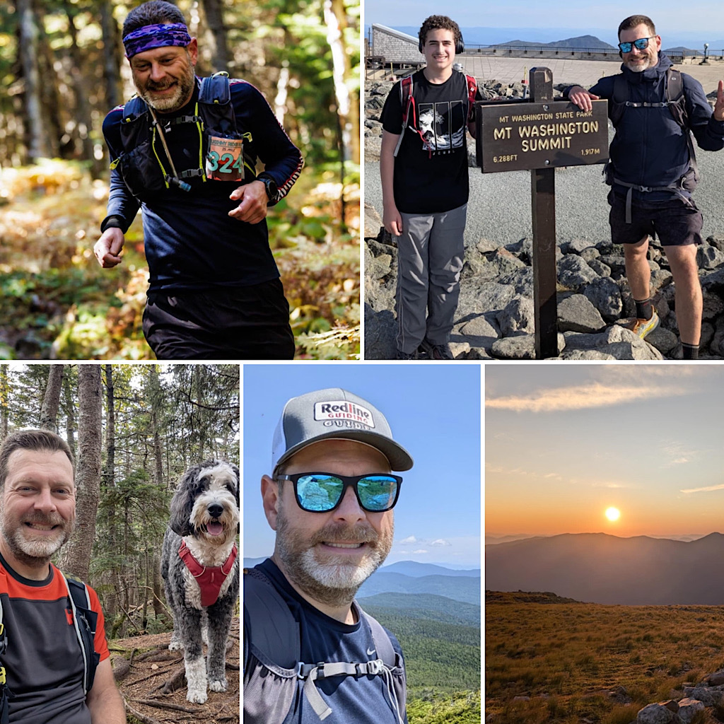 A busy summer in the Whites, I mostly “stayed local” and chipped away at my (2nd) New Hampshire 48 grid. The styles and routes were very mixed this season, ranging from speedy efforts to bang out the usual 4k’s, to taking longer and less traveled routes to the summits, sometimes off-trail and/or on abandoned trails. Along the way I managed to “grid out” the months of June through Sept, hiking and trail running solo, with friends, family, and quite often just with my dog. In July I linked up with Mt Washington Observatory Seek The Peak to serve as a steward for the event, hiking Boott Spur for sunrise. And in August, had a fabulous alpine adventure with my son, staying overnight at AMC Lakes of the Clouds Hut and summiting both Mts Monroe and Washington in very fine conditions. To cap off the season, I ran the Kilkenny Ridge Race in September for the fourth year in a row, and had my best time to date! And of course lots of cool guiding, much of it helping people with their own hiking lists and goals, very satisfying. On the board for summer 2025: 86 x 4k’s, Single Season Summer 48, and completion of rounds 21 and 22 of NH48. —Eric