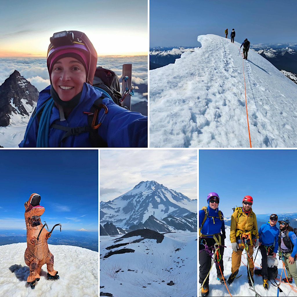 I took two trips out west to climb mountains bigger than the ones we have in New Hampshire. I (and my T-Rex costume) visited the summits of Mt. Hood (elevation 11,249), Mt. Shasta (elevation 14,179), Mt. Whitney (elevation 14,505), Eldorado Peak (elevation 8,868), Glacier Peak (elevation 10,541), and Mt. Rainier (elevation 14,411). While I was out there, I also stopped to say hi to Arlette in California! —Debra