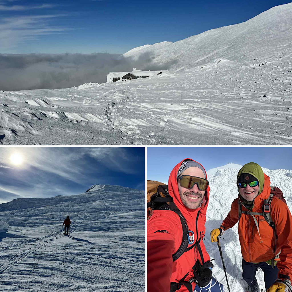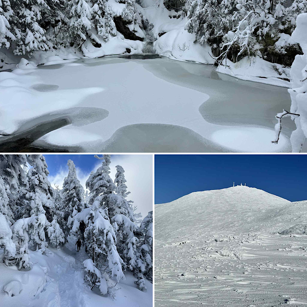 Before the hike we dropped a car at Edmands Path, taking full advantage of Clinton Road still being open, and then drove over to Hiker lot at the Cog base and started our hike up Ammo Trail to Lakes of the Clouds hut. It was both myself and my guest’s first time carrying and wearing our snowshoes on trail this season. Above the Gem Pool to the summit of Monroe snowshoes stayed on until half way down Ammo when we finally took them off and wore spikes for the remainder of the hike. Hopes were dashed when we reached the summit of Monroe. It was one of the coldest ascents of this mountain for me and I’ve been on the summit a lot. This hike took the cake. It was a spicy cold! A cold that if you stop you will be cooled down in less then three minutes. The trick is to keep moving slowly forward and not stop. Small steps to the summit and it’s all downhill from there. My guest and I talked about turning around on the summit and we agreed. It was just too cold to carry on with the plan to continue onto Eisenhower. He was happy and I was, too, because after Monroe there are no other bail-out spots until you reach Edmands Path. It was a good day to settle for one summit. Next year my guest will Grid out November with just three peaks left. —Chase