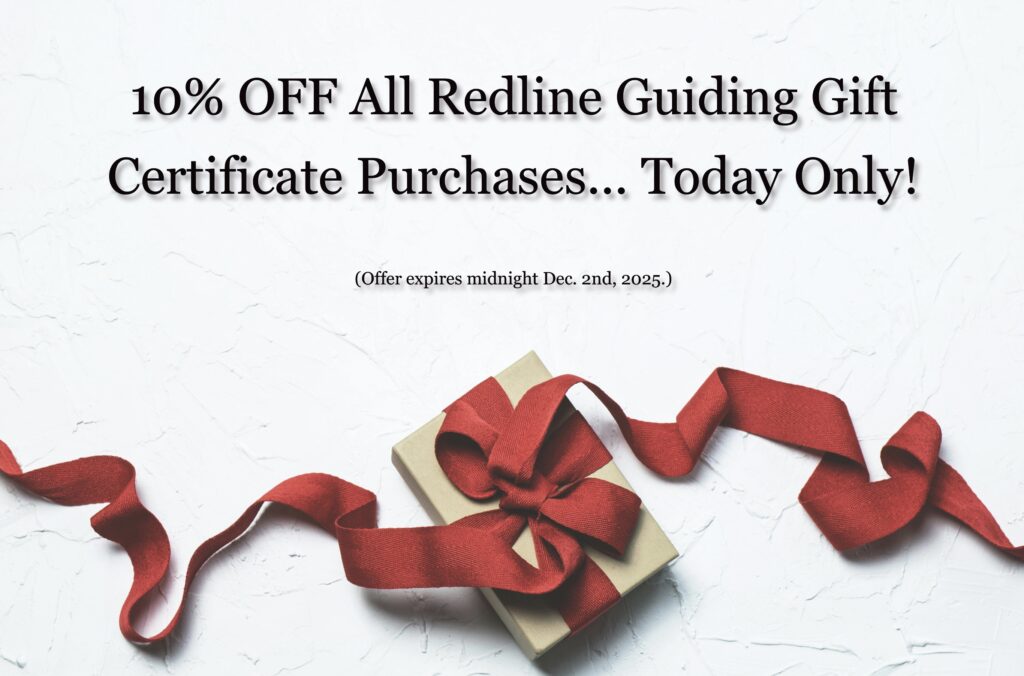 Introducing a Cyber Monday Special: 10% OFF All Redline Guiding Gift Certificate Purchases… Today Only! It’s not just for the gift giving, though it is a great gift, to be sure. Essentially it’s also a way to treat yourself to a 10% discount. A gift of adventure? A gift of education? Maybe a wedding? Buy today, decide later, but do use it within one year from issue date, please.