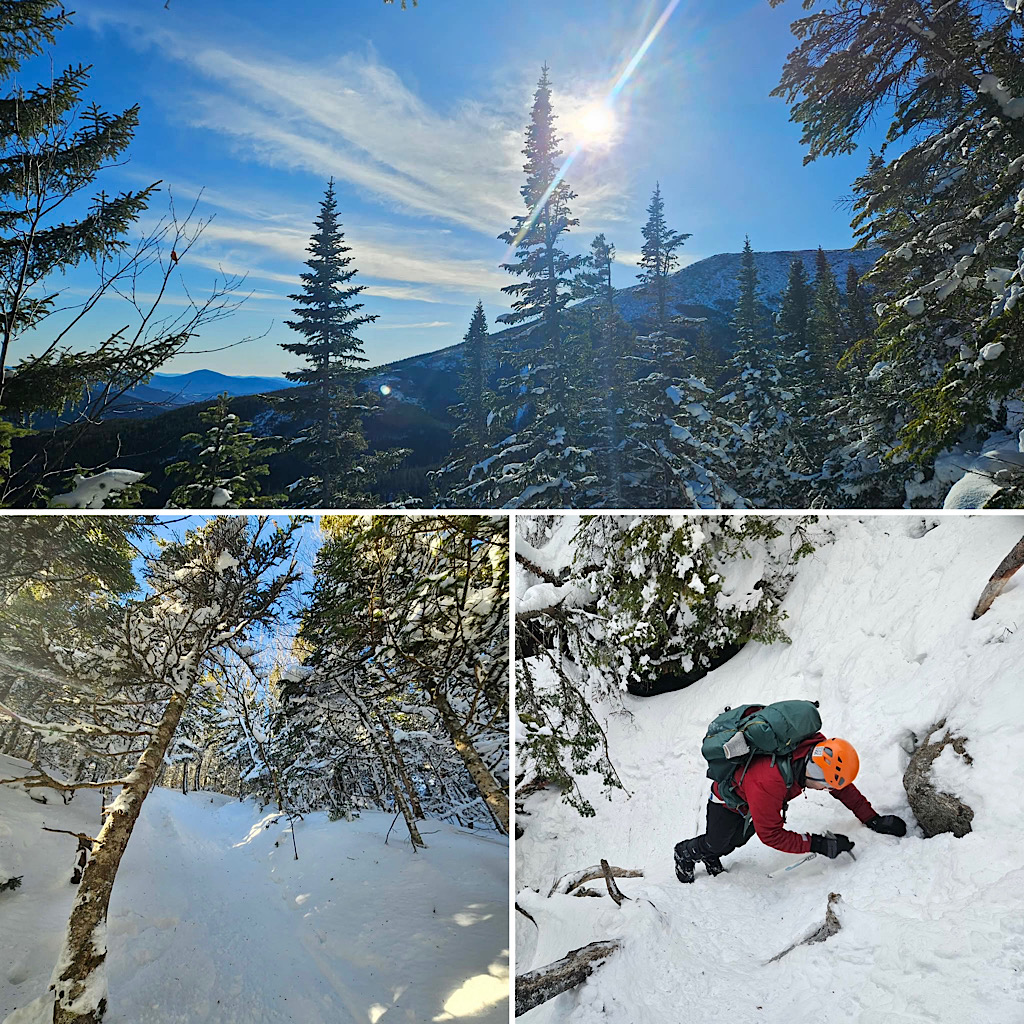A group of three young people traveled here to New Hampshire to learn mountaineeing skills and attempt Mt Washington in winter conditions. All three completed the skills training, but unfortunately one didn’t feel well on summit day and opted to return to the car at Pinkham Notch not long after beginning the approach. The other two continued on for a successful summit on a windy but blue-sky day.