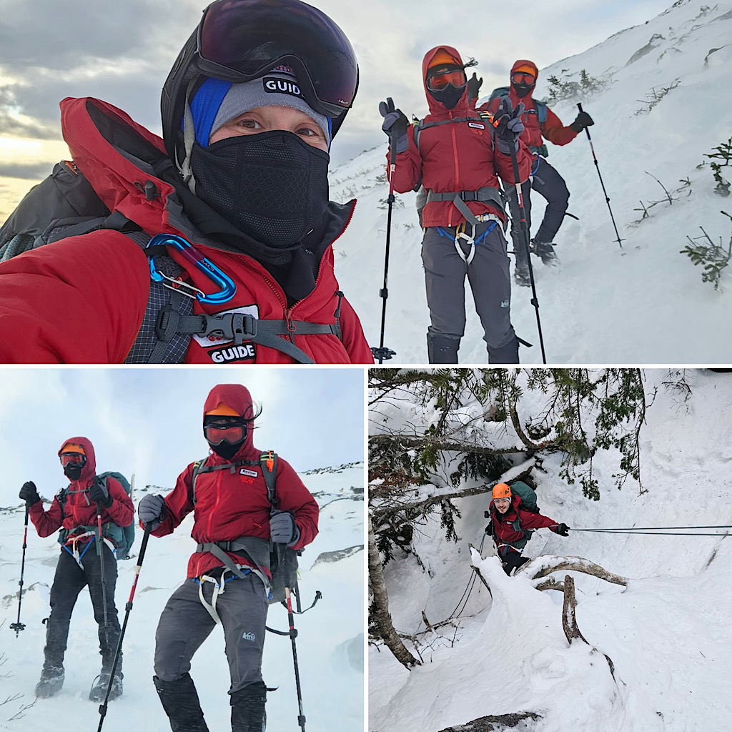 Skills & MW is what we call our Two-Day Winter Mt Washington Program, for short. It’s a very popular offering geared toward those dipping their toe into mountaineering and those wanting to climb the notorious Mt Washington on an entry-level mountaineering route — namely the Lion Head Winter Route. The program is completed over a two-day period, obviously. Day one is all about training and preparation (sorry, no photos due to requests for anonymity by two of the three). After all, we want our guests to be safe, to feel good and, while maybe silly sounding, we want them to look good, too. On day one, two half day courses are combined: our Winter Skills course and our Mountaineering Skills course. With these skills fresh in their minds, it maximizes the potential for success the next day — summit or not (though in this case they did). These two days were led by Redline Guide Debra McCown. Here are some photos and words from Debra.