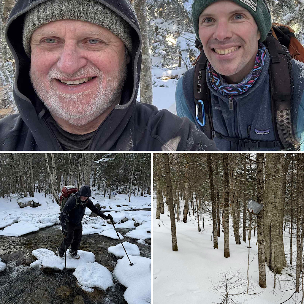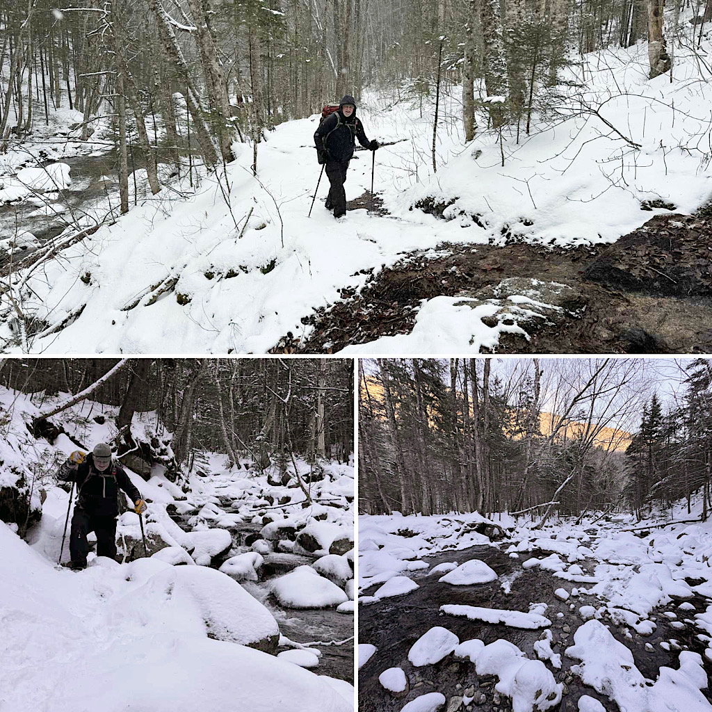 A many-time returning guest working on his Grid — meaning to summit all 48 4000-footers, every month of the year — and reached out to his permaguide Redline Guide Chase Hall. The objective this trip, if not already clear by the title, was Owls Head. Chase reported that the higher crossings were tricky and they had to get creative. The rocks, he wrote, were glazed over. He predicts a more solid base in a few days.