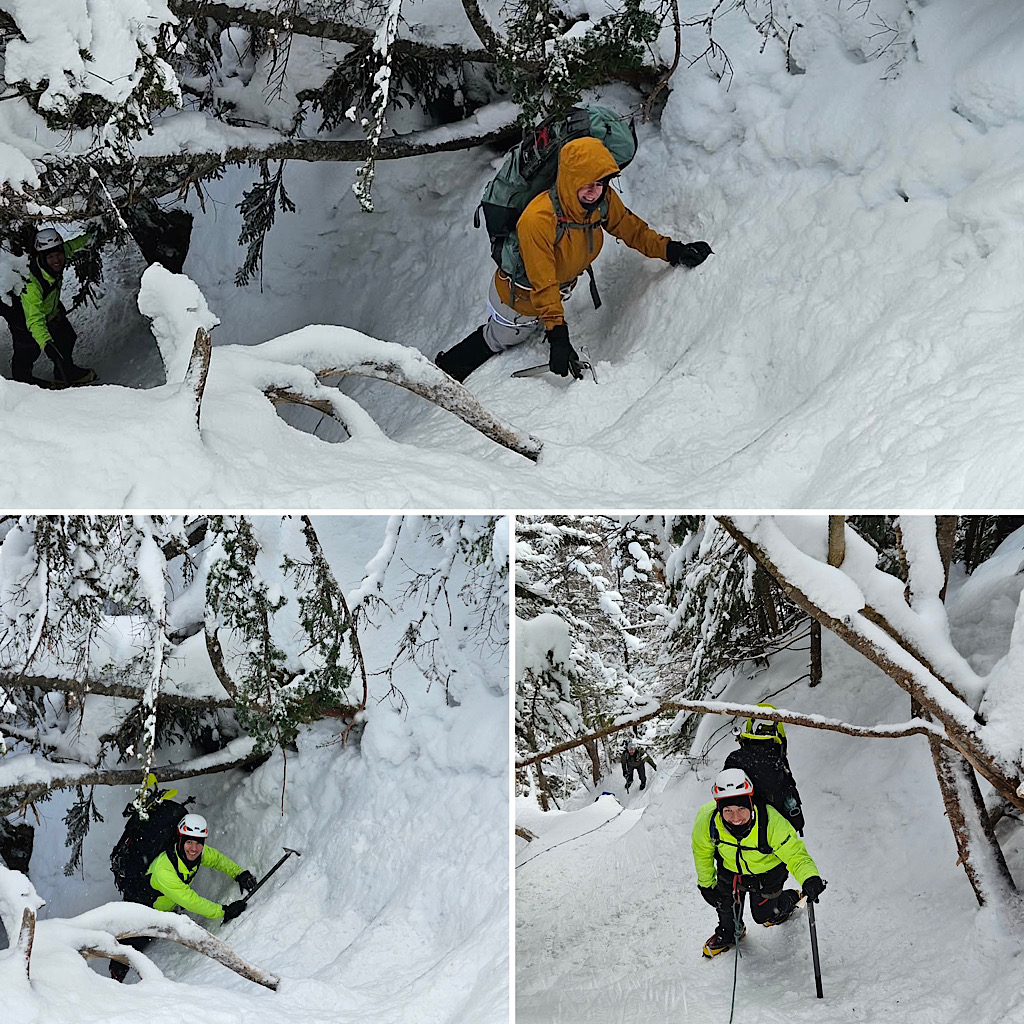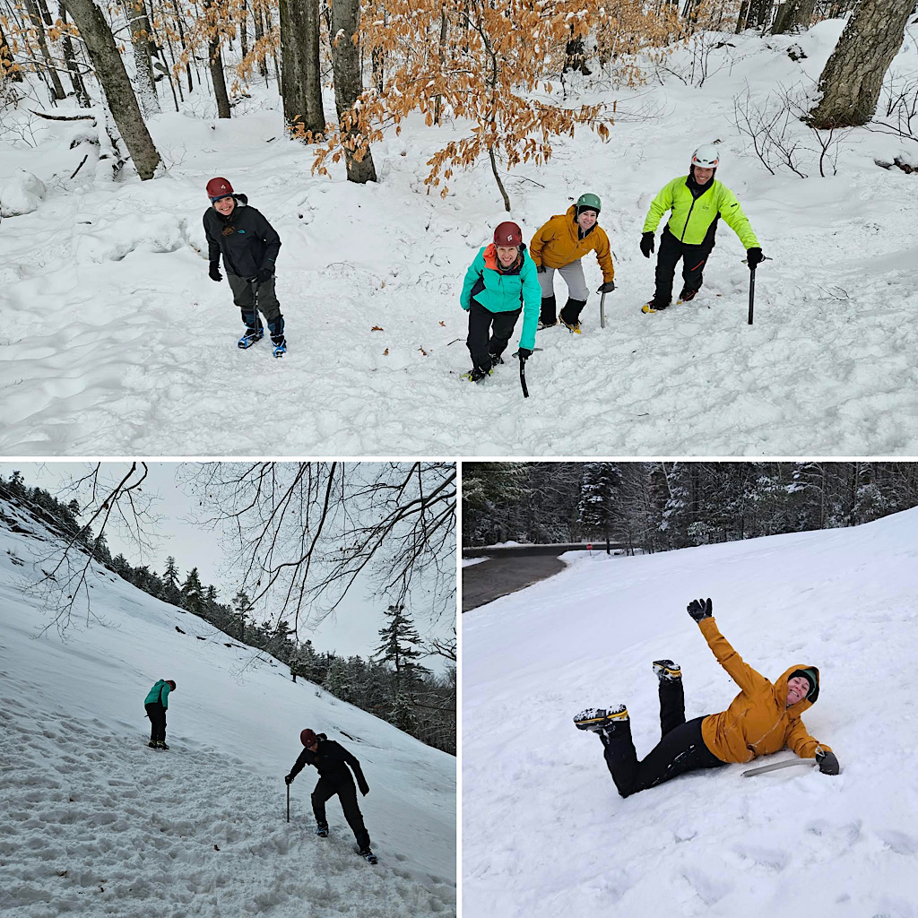 We have found that having a training day followed by an attempt on Mt Washington is an excellent strategy, one that leads to a lot of successful climbs. In doing this our guests have a opportunity to prepare themselves, their gear, and can carry themselves well on the mountain, and on busy trails like the Lion Head Winter Route, that ability and organization affects everyone in a positive way. Conversely a lack of training and preparedness can cause for real issues, even potentially affecting the safety of everyone in the area. Leading both days of this two day program was Redline Guide Debra McCown. The first day consisted of two climbers who were going to ascend with us on the second day and two other who were just spending the afternoon learning basic mountaineering skills. If we have opening in our joinable events, we’re happy to add to the trainee count. Debra’s writeup and photos to follow: