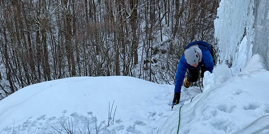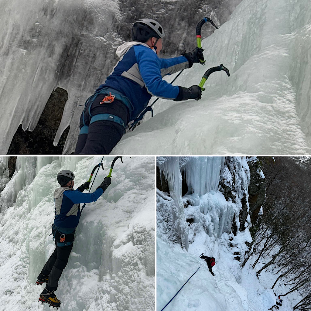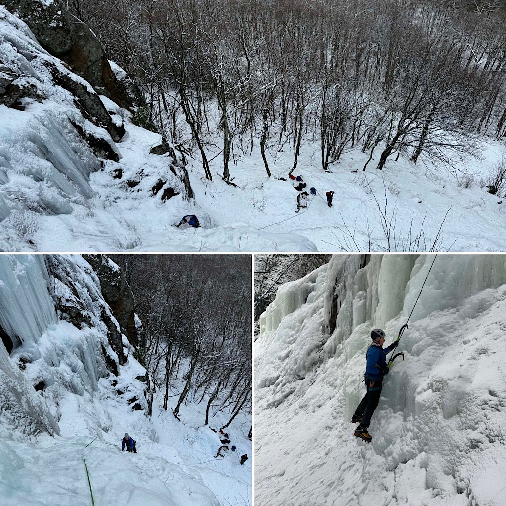 A couple of fellows from Canada reached out with intention of climbing some steep snow in the ravines on Mt Washington. They were asking that the guide meet them at the trailhead then, after a successful day of climbing, dropping them off at the Harvard Cabin for the night while the guide headed back down. This plan, as we learned, was going to undergo a metamorphosis. The first change was to add a second day with the hopes of getting in some ice climbing with their mountaineering. The next change was to revert back to a single day of climbing, but on a different medium: instead of steep snow, the duo opted for a single day of ice in Crawford Notch. That’s what they ended up doing, with Redline Guide Glenn Van Neil leading. The day was on the wet side so photos are limited, but we did get these shots…