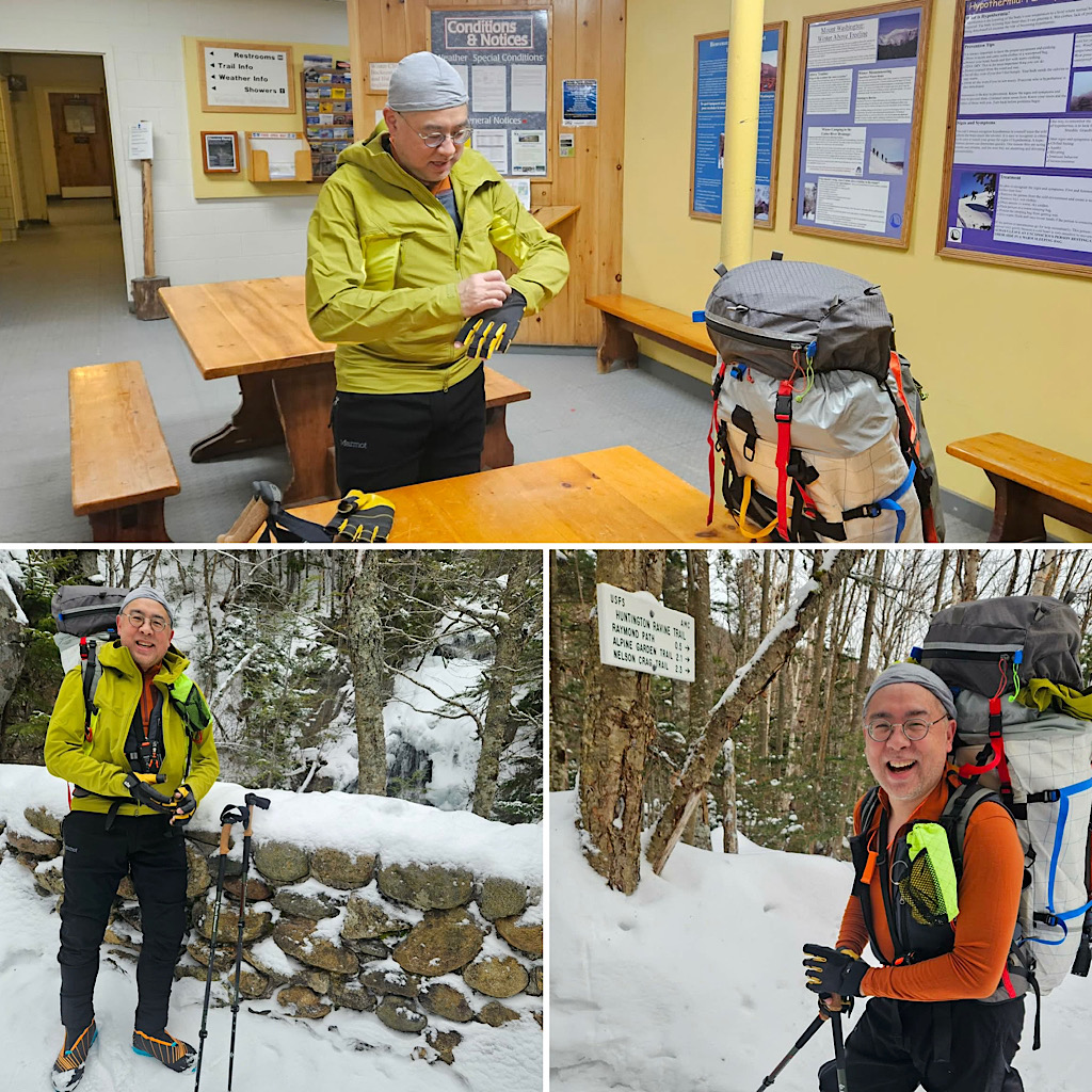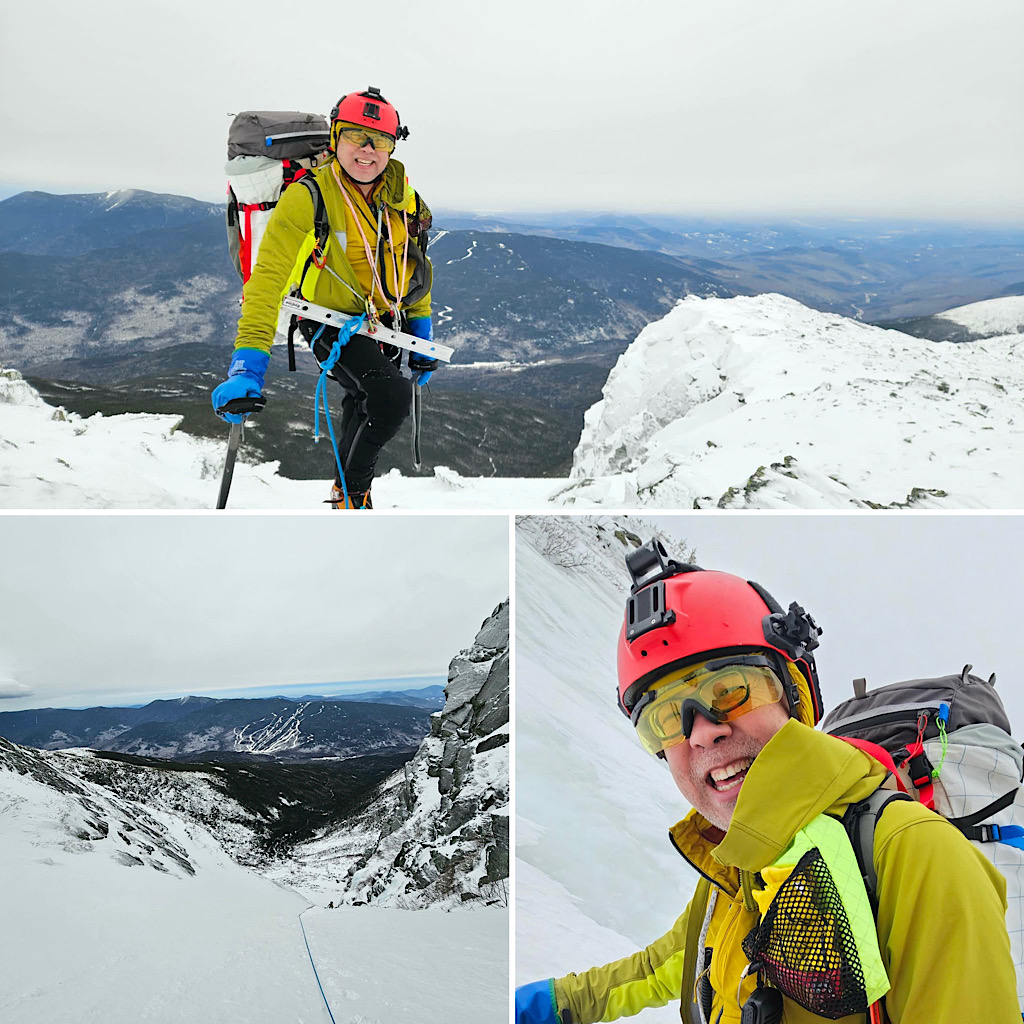We then headed up into Huntington Ravine at a slow and steady pace, walking up the fan and past Pinnacle Gully to reach Central. He remembered soloing the route in his 20s — but, this time, was happy to have a belay coming up the ice and an anchor to rest at before continuing up the snow. As we neared the top, we were showered with spindrift, and we topped out in classic Mt Washington wind and blowing snow. He stopped often along the chilly walk across the Alpine Garden Trail, taking in the unique views he remembered.