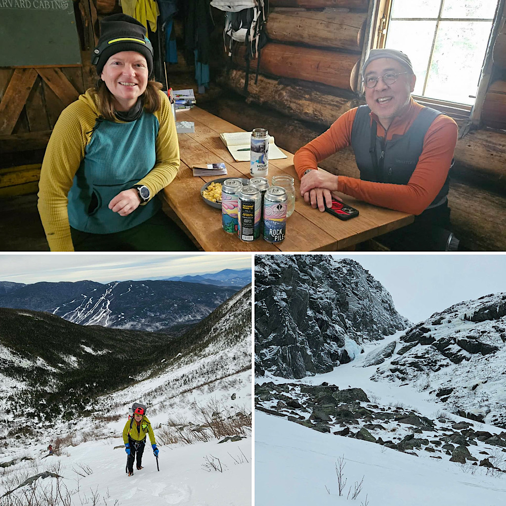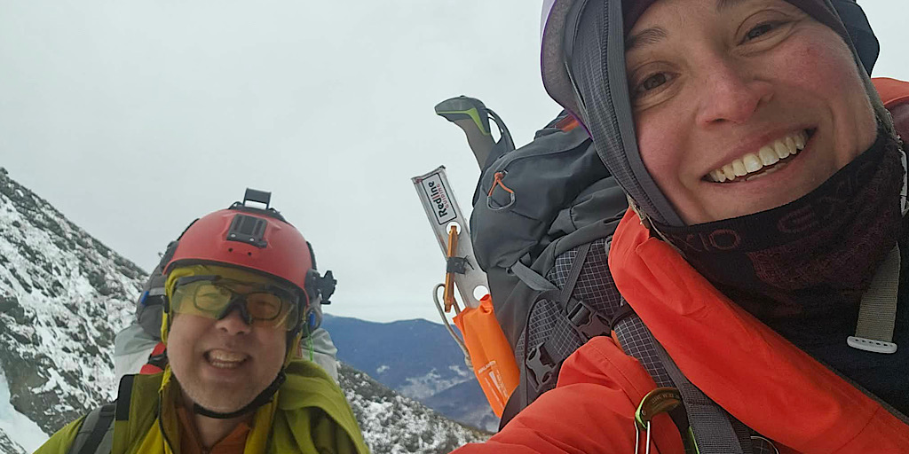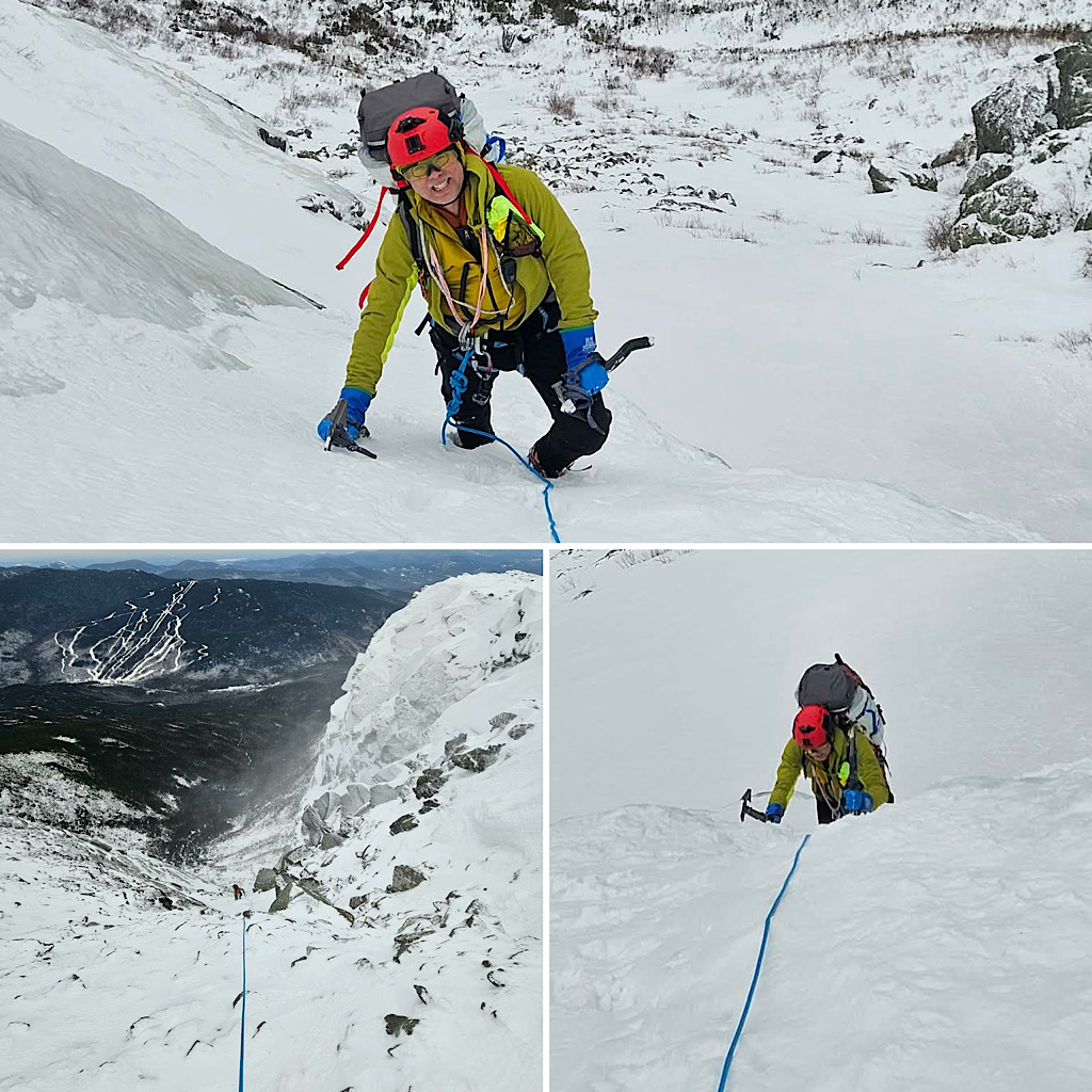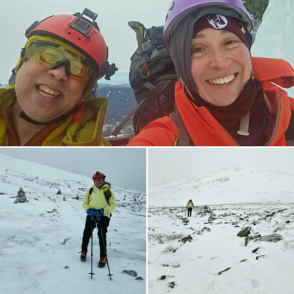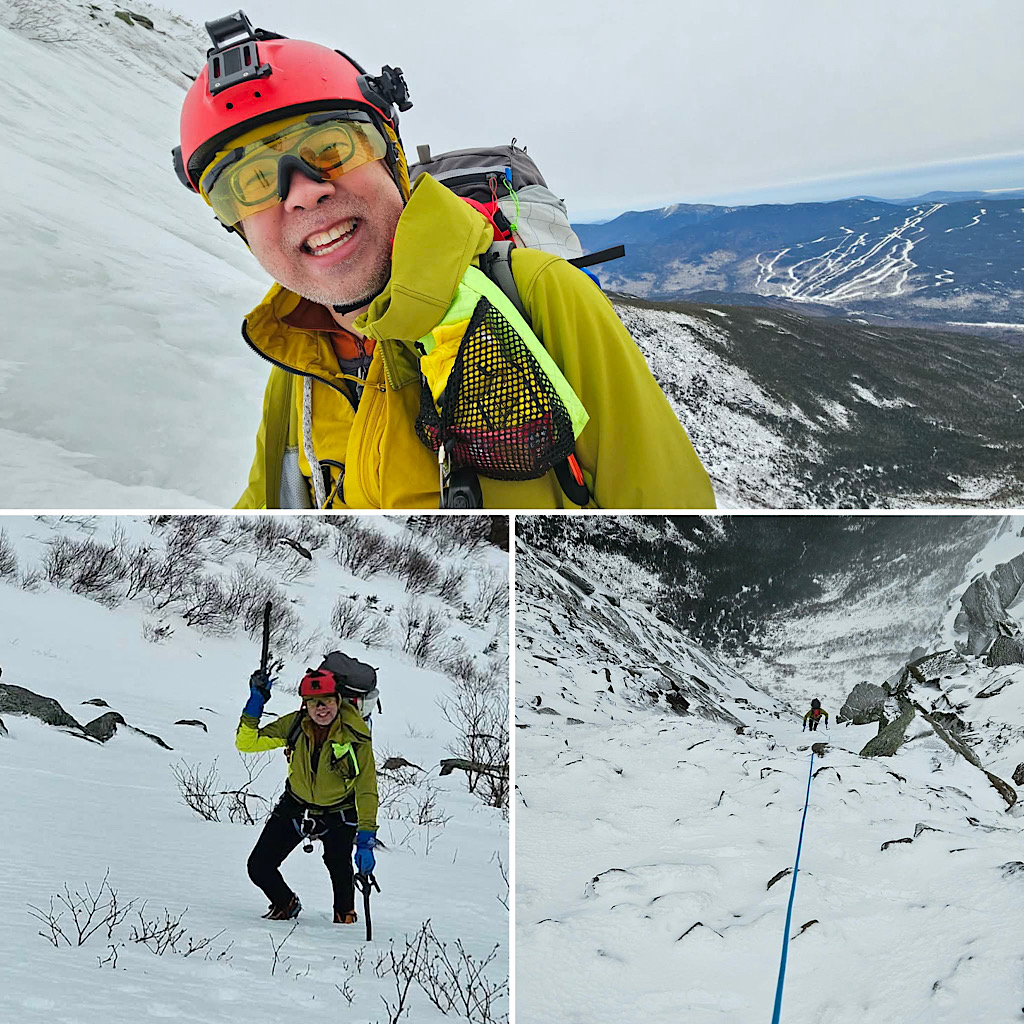 We spend decades living large in the years of our youth but we do age, and as time passes that aging becomes more and more apparent to us. Yet, we yearn for the glory days, hoping for more of the same. To continue, to carry on, to reach for and meet our limits. This can be hard; a challenge to us. It doesn’t get easier, as they say — and as we begin to realize for ourselves. We learn that what was easy isn’t as easy thirty years later. This sums up the situation at hand: a guest reaching to us out hoping to re-live his past mountaineering days in the gullies on Mt Washington. Self aware, our guest knowing he’s not as fast or as strong as he once was, wisely decided to hire us, to lend a hand, to provide backup, to remind him of things he may have forgotten. It’s all about having peace of mind and staying safe. For this trip, taking on Central Gully in Huntington Ravine we put Redline Guide Debra McCown on the calendar. After the trip she provided the following summary and photos…