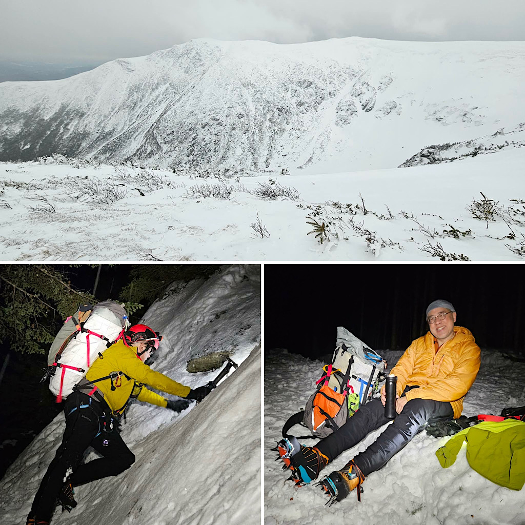 This guest said that he’d climbed every gully in the ravines… 30+ years ago (or, as he described it, ‘last century’). He asked to visit Mt Washington again for some mountaineering — and even bought new boots for the occasion. I suggested Central Gully, a classic snow climb with a small ice bulge, as a good place to walk down (or, in this case, up) memory lane in the heart of Huntington Ravine.