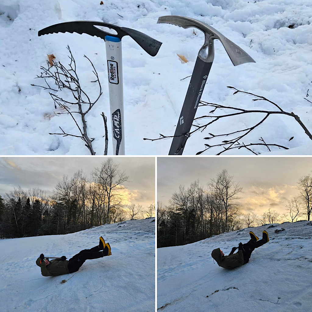 A couple of serious hikers with an impressive backpacking resume came to learn ice axe and crampon skills to assist them in tackling wintry adventures. For one of them, this would be her first experience using this gear. So, while she said a New Year’s Day summit of Mt Washington would be nice, getting comfortable with the gear and learning skills she could build on was her main goal.