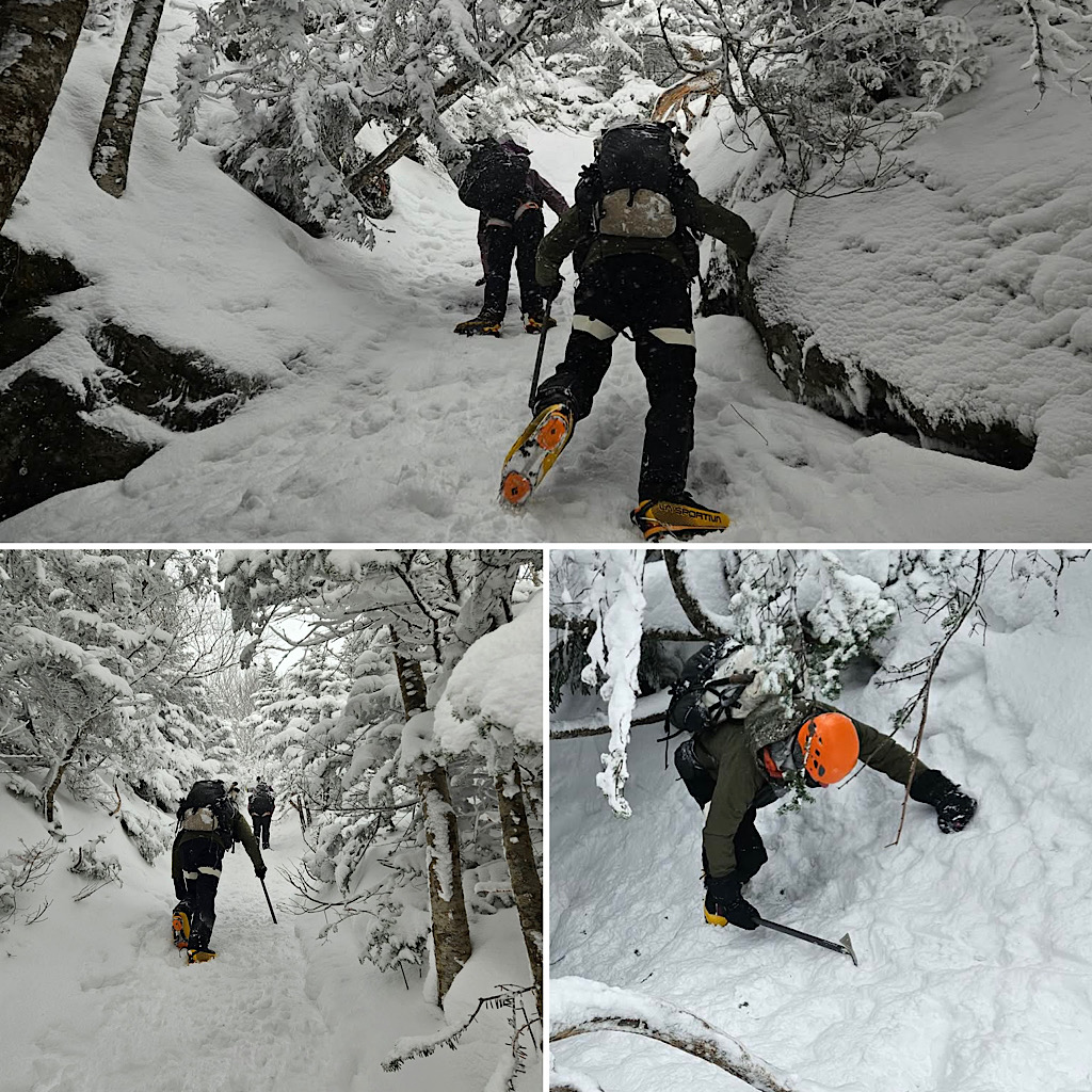 A couple came to us ready to start the year right. They began by taking our combined Winter and Mountaineering Skills courses on the final day of 2025. They then followed this up with a Mt Washington summit attempt on the first day of 2026. This was all part of our Two Day Winter Mt Washington Program. They didn’t summit, but between the high winds and frigid temps — what the mountain is known for — they did get a serious taste of the alpine environment which is memorable, fascinating, and sometimes scary. Both days were led by Redline Guide Debra McCown. Here are some of her words and photos.
