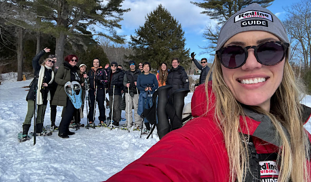 A tech company out of Somerville, Mass, asked if we were available to lead a large group snowshoe tour at a private retreat in the Lakes Region. As a matter of fact, we were, and happy to do so. For this short snowshoe hike on mostly groomed trails on private lands, since this was in a non-wilderness area, only one guide was requested. We asked Redline Guide Bethany Bourget if she would lead and she was happy for the opportunity. According to the company spokesperson, they were delighted with her stating that “Beth is AMAZING.” We love hearing this… and seeing these fun photos of a group clearly having a good time: