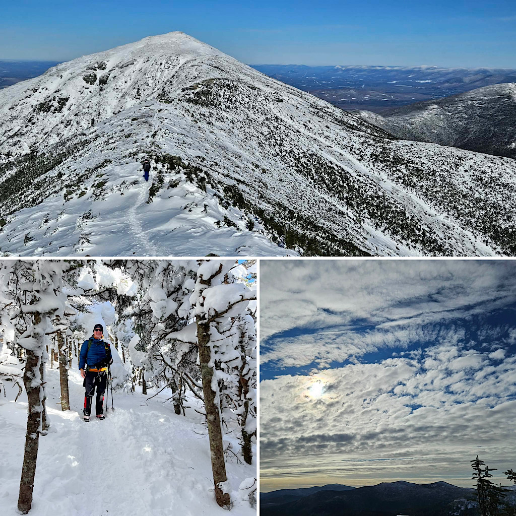 You can’t crunch along on top of the snow on Franconia Ridge in those conditions, looking at 360-degree views into northern New Hampshire and Vermont, without the joy showing. To top it off, I kept running into people I recognized. I ran into a hiker I knew in the parking lot at the beginning, another on the summit of Mt Lafayette, and one more in the parking lot at the end.
