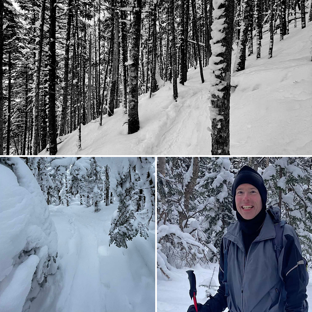 Our many-time returning guest was back again to continue chipping away at his winter list. Friday we were spoiled on his longtime nemesis Monroe, where the conditions were just about perfect. Some of the rarest words in the Presidential Range are ‘Light & Variable,’ yet here they were for the 3rd time in 5 days. If this keeps up, we’re going to start getting spoiled. Have no fear though, Mountain Goddess would have the last laugh with an arctic blast planned for Sunday, originally intended to be our second day out. Thankfully for all parties involved we had some flexibility in the schedule and we were able to thread the needle by pivoting to a Saturday morning ascent of Mount Cabot. The land of marshmallow trees treated us well and we got back to the car just as the winds picked up and the bottom started to fall out of the thermometer. It doesn’t always go as planned, but it’s fun when it does. Good to see you again, guest. We’ll see you soon enough for the last 12! —Mike M.