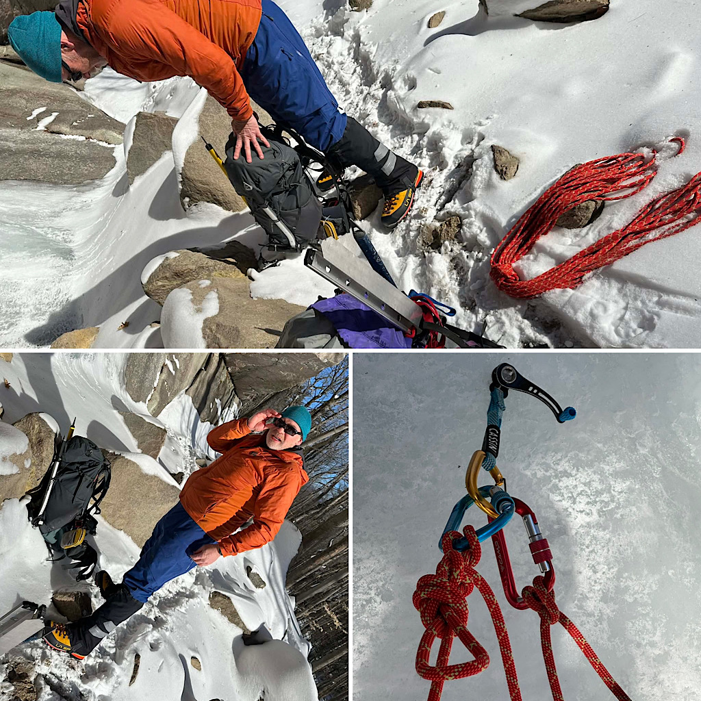 We just had a guest with us for a couple of days seeking this sort of training. It’s quite doable as long as we have snow slopes of various angles and dimensions, we can offer a richly reward experience. In this case our guest booked a two-day training experience, looking for greater depth of understanding and more repetition than our one-day offering. Leading this class was Redline Guide Will Murphy. Will has a considerable amount of experience on glaciated terrain so it was a natural fit that he shared what he knows. What follows are a few photos of this experience.
