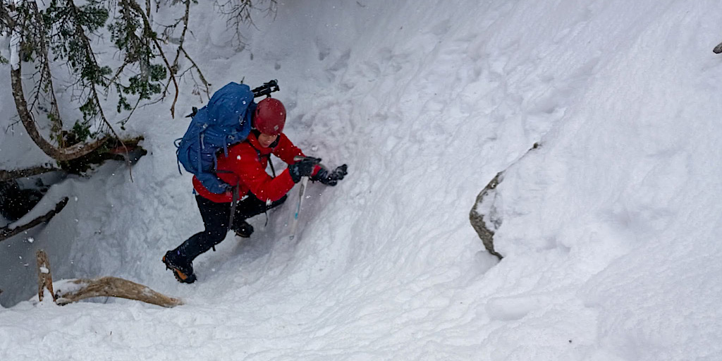 A returning couple came to us hoping to partake in our two day Winter Mt Washington Program, but there was a twist. Due to child care considerations they would have to do this over a period of four days. One member would do it the 13th and 14th, while the other person watched the kids, then the two would switch roles. Leading the first two days was Redline Guide Timothy Wentzell. Here are some photos of their epic. (Stay tuned for part two, in progress as we write.)