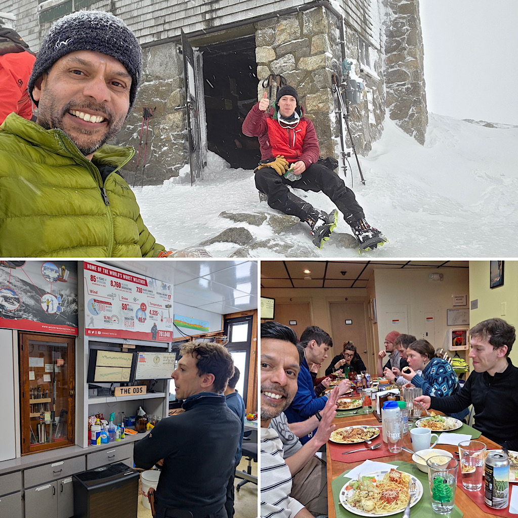 Not to be confused with last week’s MWOBS trip. this group was originally slated for a date in January. It didn’t happen, though, thanks to insane triple-digit wind speeds, and negative double digit temperatures at the time. Thankfully our partnership with the Mt Washington Observatory (MWOBS) is a solid one and they were able to come up with an alternate weekend for us. And as out turned out, mostly everyone from the original cast was able to pivot and join this new adventure. We had hopes that this new weekend would be doable. And it was. It wasn’t easy for the team, though. The predicted wind speeds weren’t going to make this trip a cake walk. The team, both guides and guests, were going to have to push hard, both up and down. Thankfully temperatures were not forecast to be super cold.