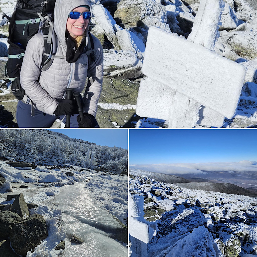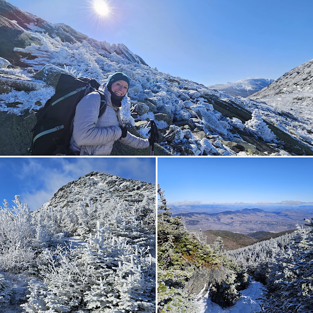 The next morning, the weather offered us a delightfully calm and sunny weather window, and we took advantage of the opportunity to summit Mt Madison. Thanks to the overnight drop in temperature, the trails had firmed up, and walking up the monorail to treeline was considerably easier than it had been the day before. The hike up to the summit cone of Mt Madison was relatively straightforward on rock with patches of solid ice and rime ice. The weather and views were great, and with improved conditions, I was itching to grab at least one more peak while the weather held. But the guest had a timeline she wanted to meet: be back to the car by 4PM so she could begin her long drive home. So, we returned to camp, packed up, and descended Valley Way, where trail conditions now presented a new challenge: everything that had been wet, slushy, and unstable the day before was now a solid sheet of ice. Even with good traction on our feet, conditions were horrendous. It was a slow and tedious descent, and it was almost 4 p.m. when we arrived back at the parking lot.