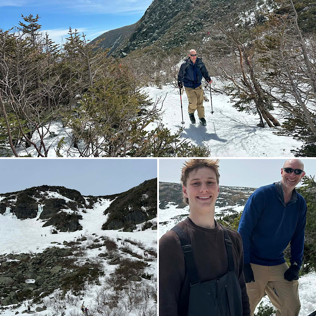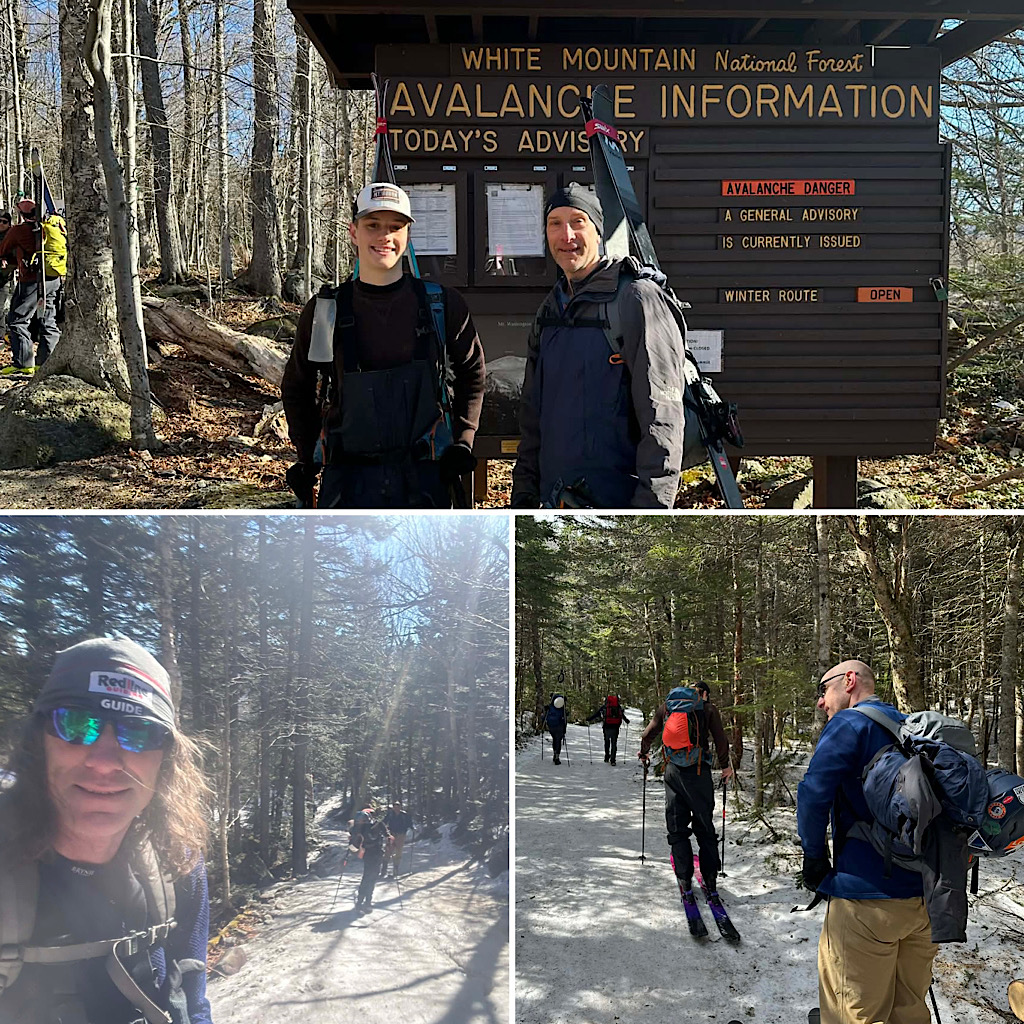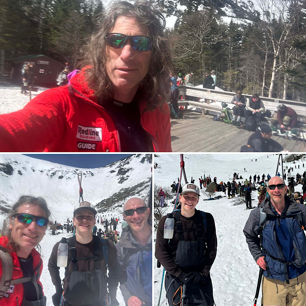 We had one more group up there on Mt Washington, this time with Redline Guide Will Murphy. There were able to start skinning up Tuckerman Ravine Trail about a mile in and at the end of the day they were able to ski out on the Sherbie until the third water bar. From there they hiked. This was another father-son duo thing, getting the kids hooked — the father’s 16 year-old this time. The highlight of the day was that they were able to ski Right Gully including the steep west wall. Here are a few photos (and one video) of the day…