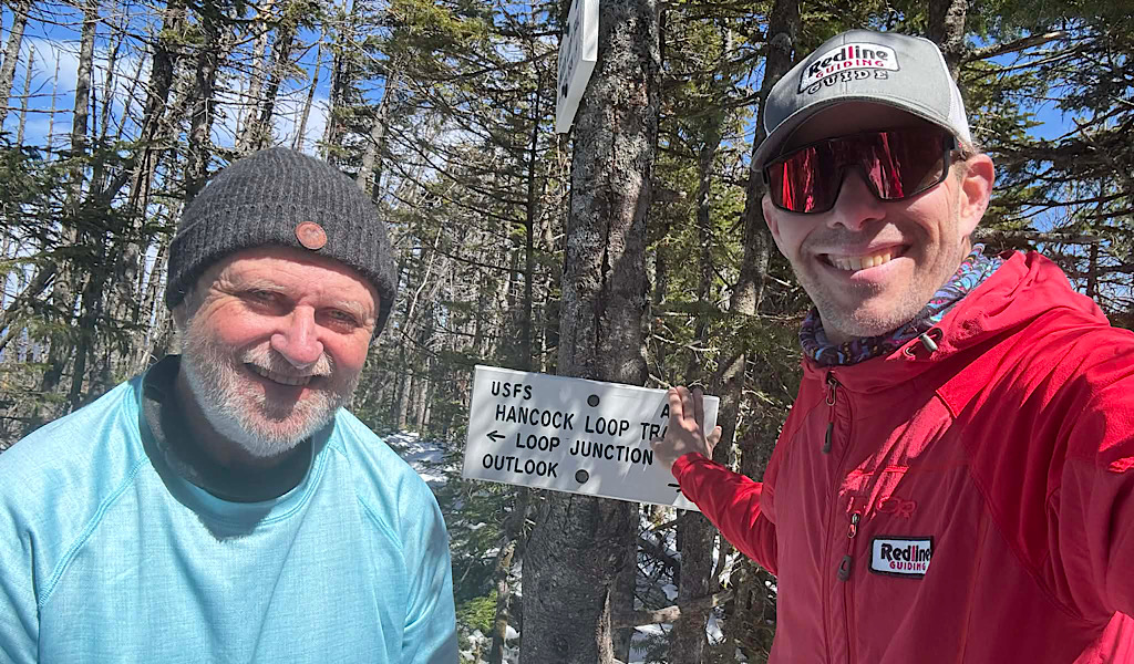 The snow crunches underfoot while the sun warms our faces, then a gentle but cooling spring breeze makes us yearn for more sun. While ground conditions can be challenging at this time of year, the waffling temps are a delight. A tug-o-war between too hot and too cold. The result, in a way, is perfection. This post highlights a hike with our oft-returning Grid Gettin’ Guest. The objective was The Hancocks, and leading, as usual, was Redline Guide Chase Hall. Here are some photos…