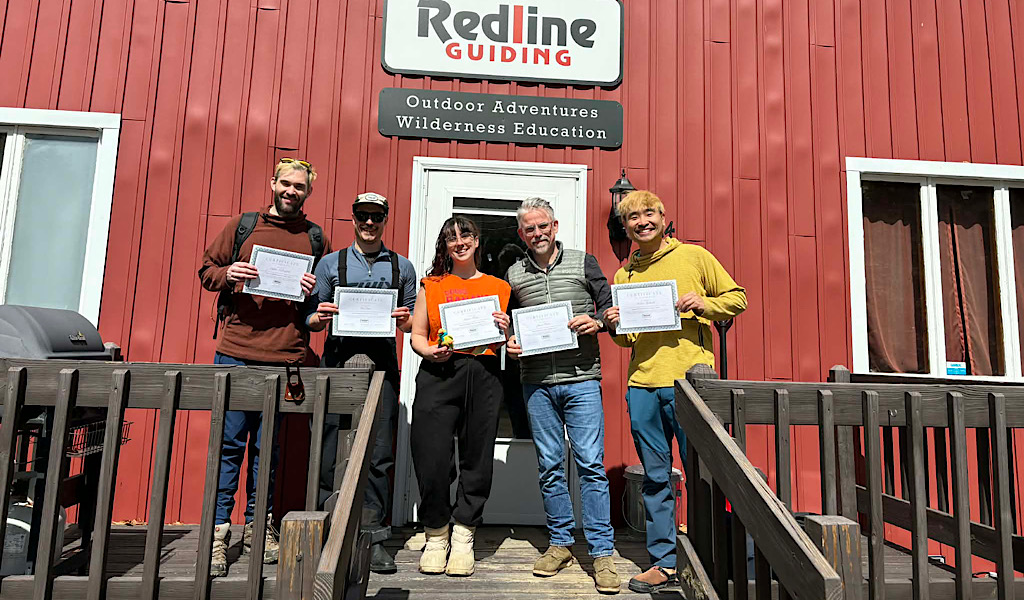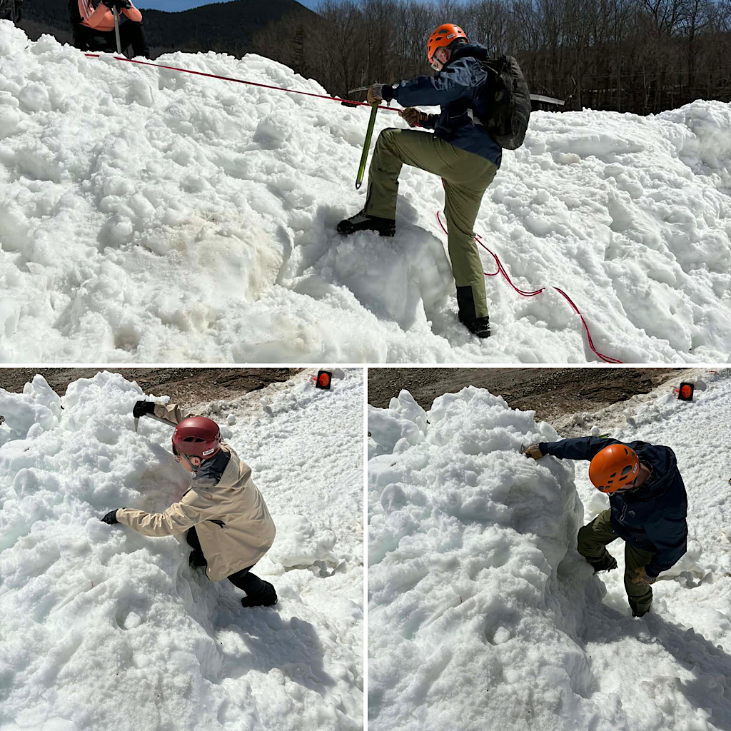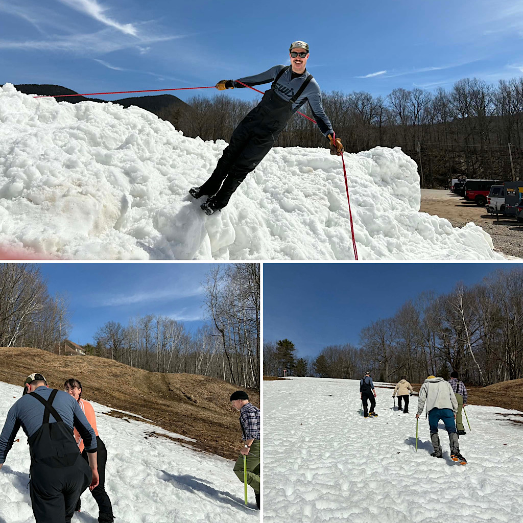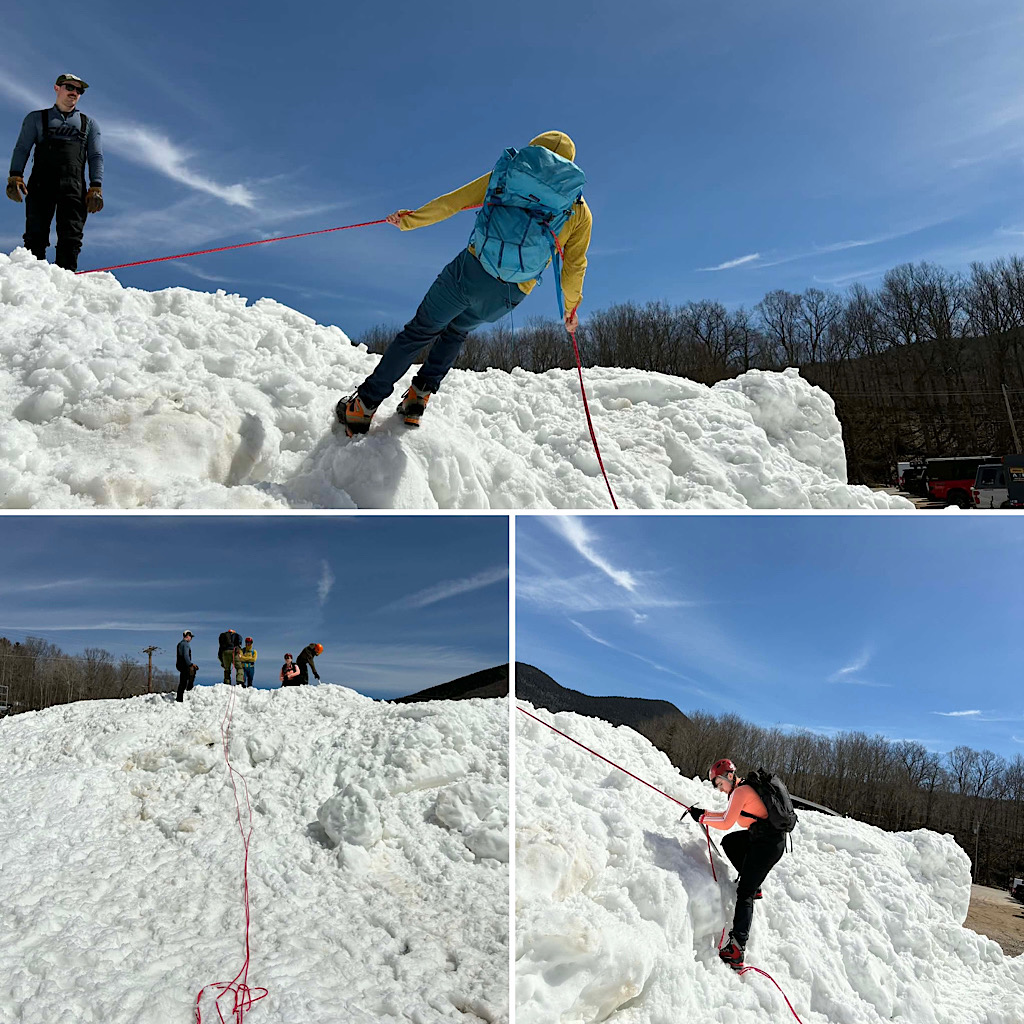 We love that we are able to extended the season down here in the Mt Washington Valley as it concerns Mountaineering Skills training. This is perfect for those who want to do this in the spring — perhaps preparing for some big climbs elsewhere in the world or maybe just hoping to avoid the cold of winter. While we still have good, climbable snow on Mt Washington and at higher elevations, the Valley is pretty much cooked. That said, thanks to our friends at Black Mountain Ski Area in Jackson, we’re still going strong. Leading this group of five was Redline Guide Pat Ferland. According to Pat this half day class went amazingly well and they all had a lot of fun. What follows are some photos he took.