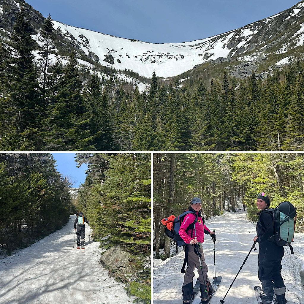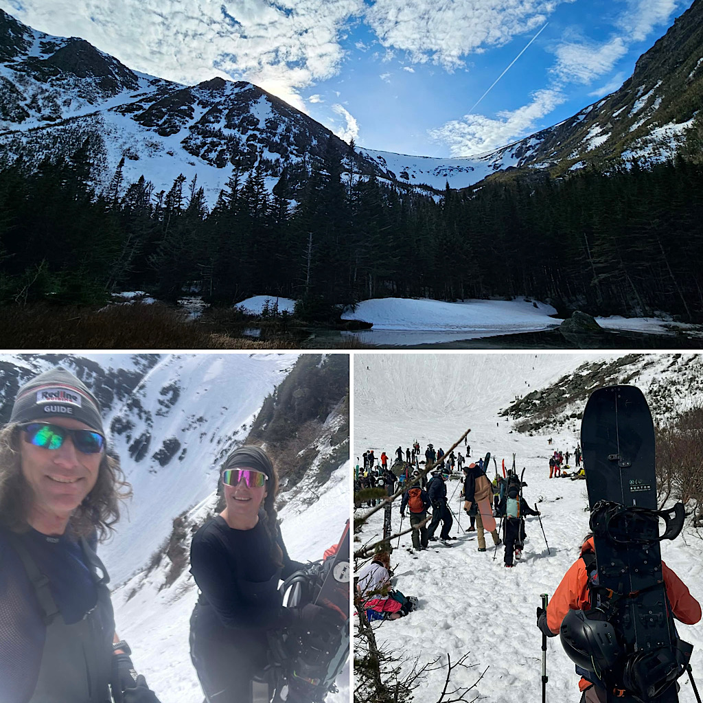 Report: We were able to skin the entire way up Tuckerman Ravine Trail ascending to the Ravine itself. To ski/ride we selected Right Gully and topped out, then enjoyed a good descent to the floor [of the Ravine]. On exit, we were able to ski most of ‘Sherbie’ with some walking added in. —Will