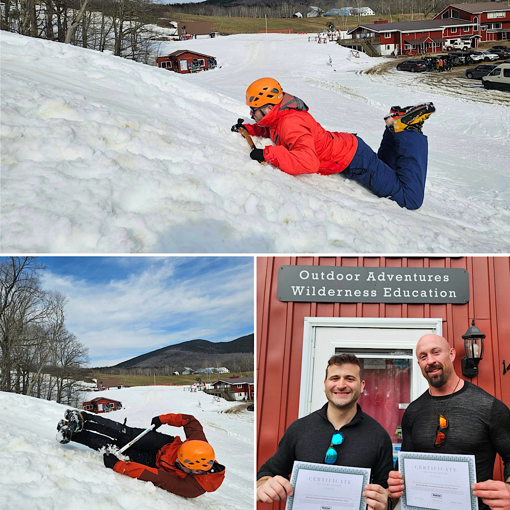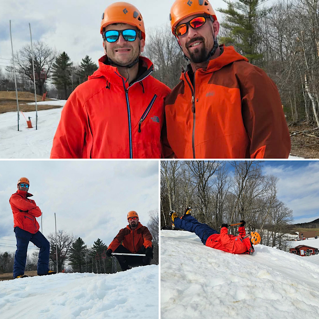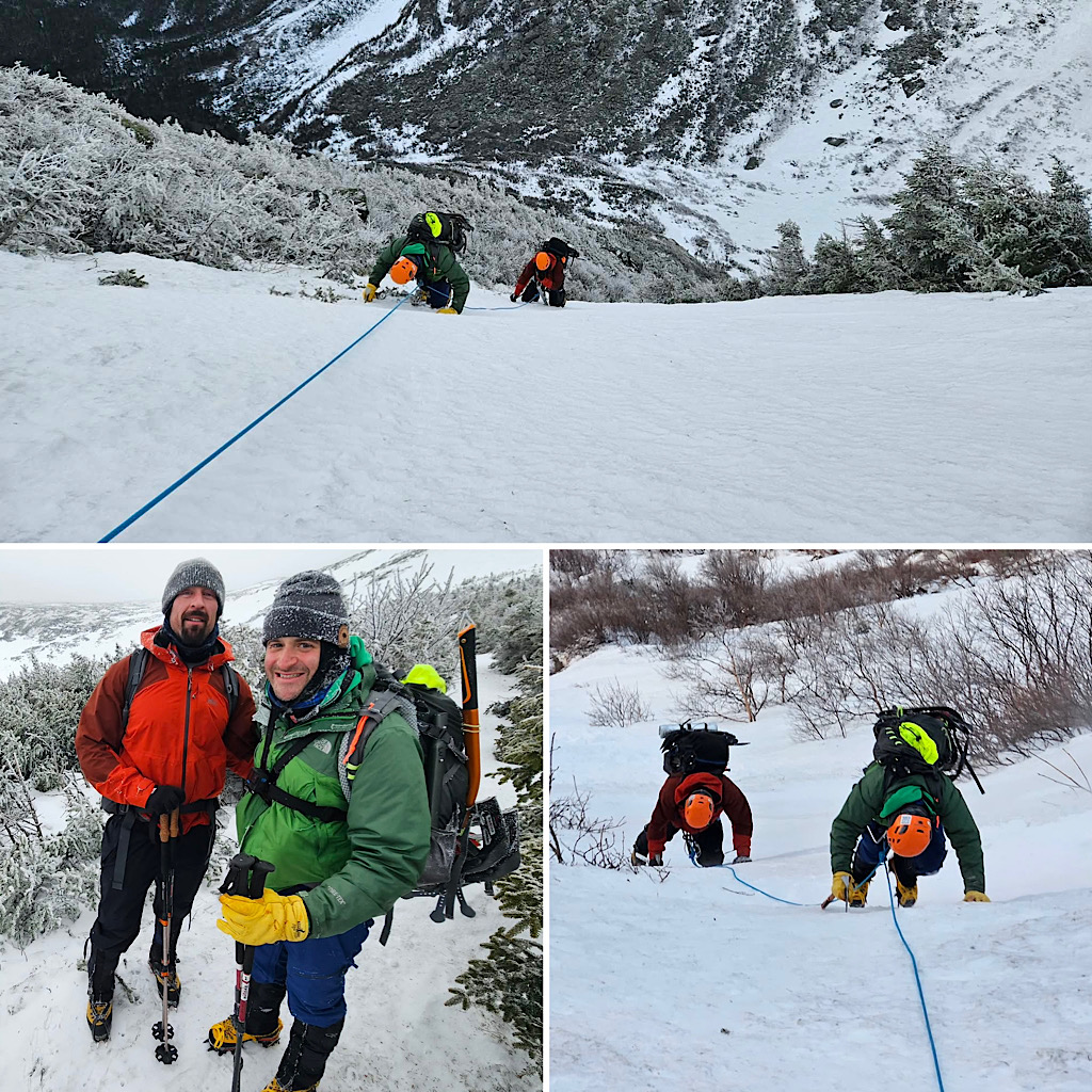 At this time of year the Lion Head Winter Route on Mt Washington either closes or it just falls apart and becomes something we’d rather avoid. This doesn’t close the doors on our mountaineering programs, though. For training we head on over to visit our friends at Black Mountain Ski Area in Jackson, and for getting on steep snow we have a bunch of climbable couloirs throughout the Presidential Range. Of course, when we’re competing for steep snow with the Tuckerman Inferno race folks, we have to get creative. That’s what Redline Guide Debra McCown did with two students partaking in our Two Day “Winter” Mt Washington program. Keep reading for Debra’s words and some photos.