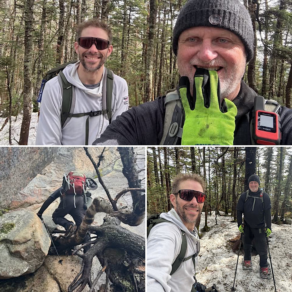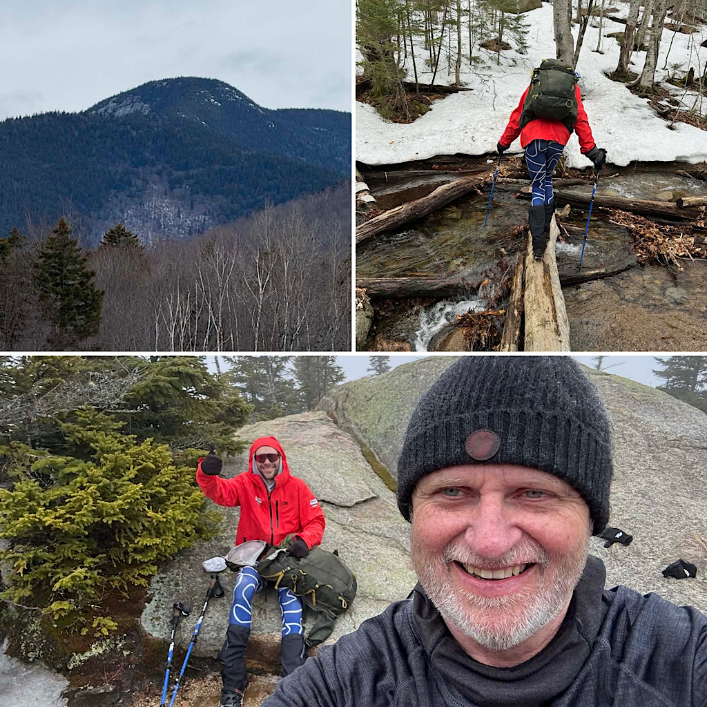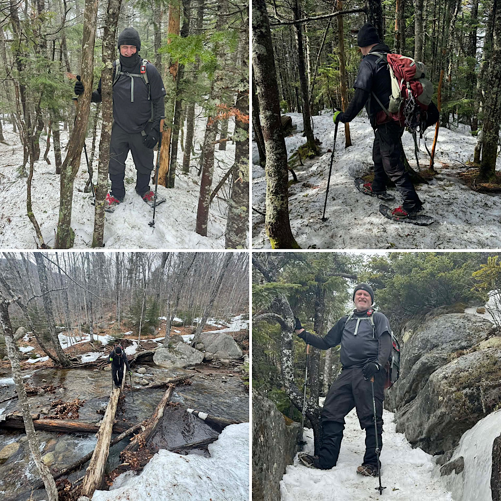 Passaconaway and Whiteface have been gridded out, my 18th and 19th peaks completed. Also, peaks 508 and 509/576. I should hit 90% complete by the end of the month. Conditions were typical for the spring (they were all over the place, from good footing to tons of flow ice on the trail between the two peaks). I was in microspikes and snowshoes all day which helped on the water crossing keeping me on the log. Good day with Chase. –GGG
