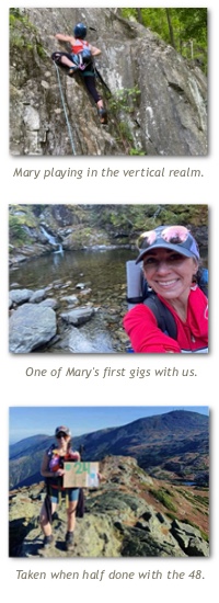 Résumé: Mary is a Nurse who also holds her BLS-I and has taught numerous CPR classes to both providers as well as patients. She has completed the NH 48 as well as the VT 5 (most of them as a solo hiker) and has hiked over 100 miles of the NET. Mary has also completed both a single day Presidential Traverse, single day Pemi Loop, and a single day Franconia Ridge Traverse (from Flume to Lafayette).